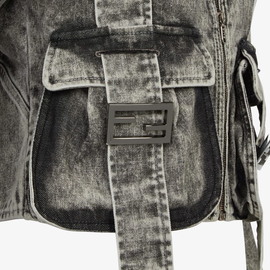 Cropped jacket with V neck and long sleeves. Zipper closure. Made of black cotton denim with vintage treatment. Embellished with a zipper, oversize gusseted pockets with straps and matching FF Baguette buckles.
