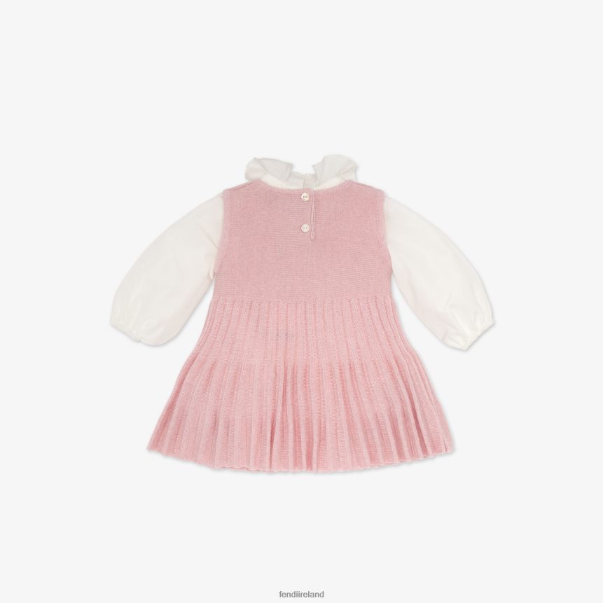 Pink knitted wool baby dress with tone-on-tone Fendi embroidery and tobacco bow. The dress comes with a white poplin bodysuit with collar.
