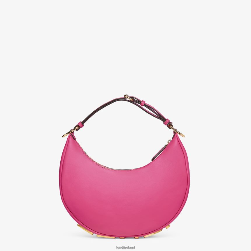 Small hobo bag made of soft, fuchsia leather, decorated with vintage gold metal FENDI lettering visible when wearing the bag under the arm.