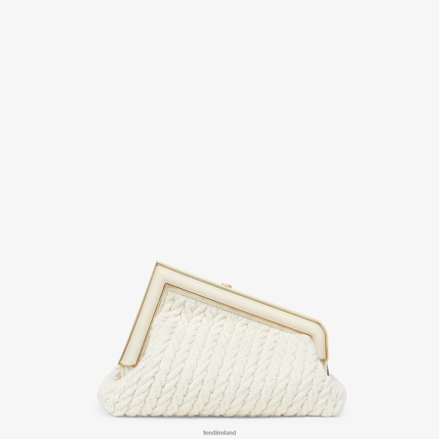 Small Fendi First bag made of finely interlaced white fabric, with an oversized metal F bound in tone-on-tone nappa leather.