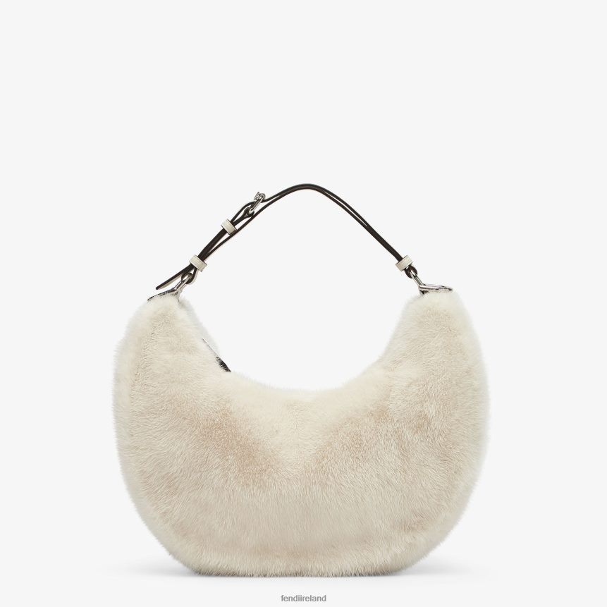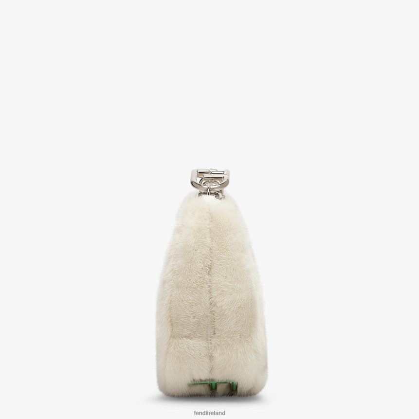 Small hobo bag made of soft, off-white mink, decorated with green metal and plexiglass FENDI lettering visible when wearing the bag under the arm.
