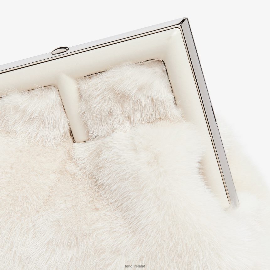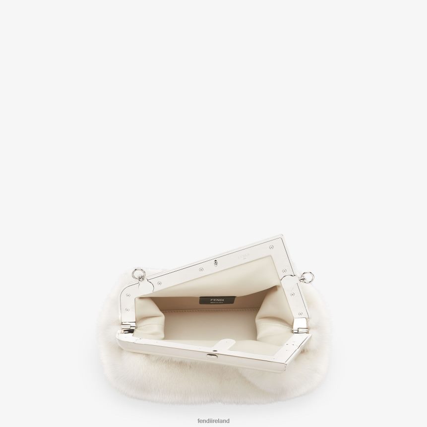 Small Fendi First bag made of soft, off-white mink with oversized metal F clasp bound in tone on tone nappa leather.