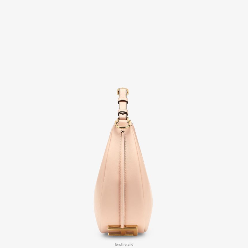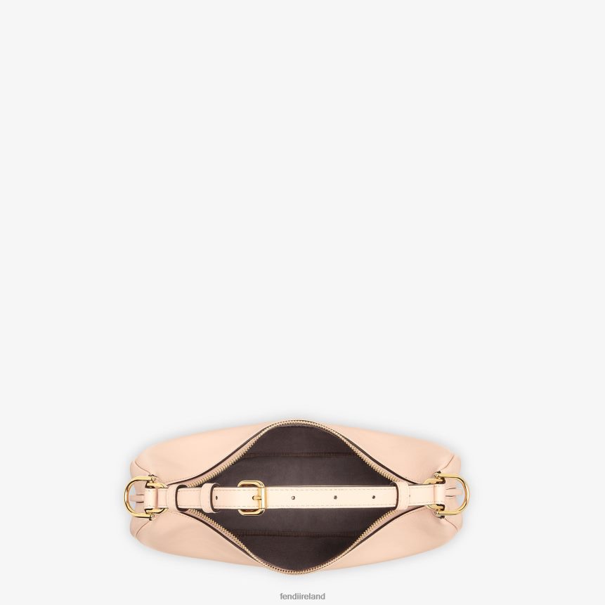 Small hobo bag made of soft pale pink leather, with vintage gold metal FENDI lettering visible when the bag is worn under the arm.