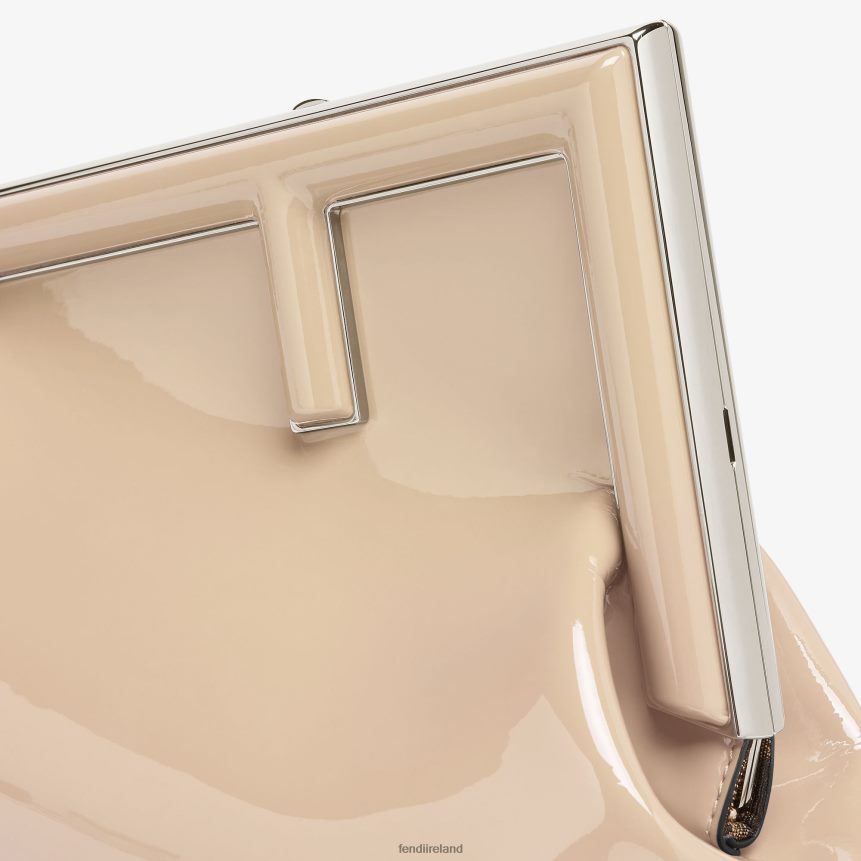Fendi First bag in the perfect size for daytime, made of beige patent leather with oversized metal F clasp bound in tone on tone patent leather.