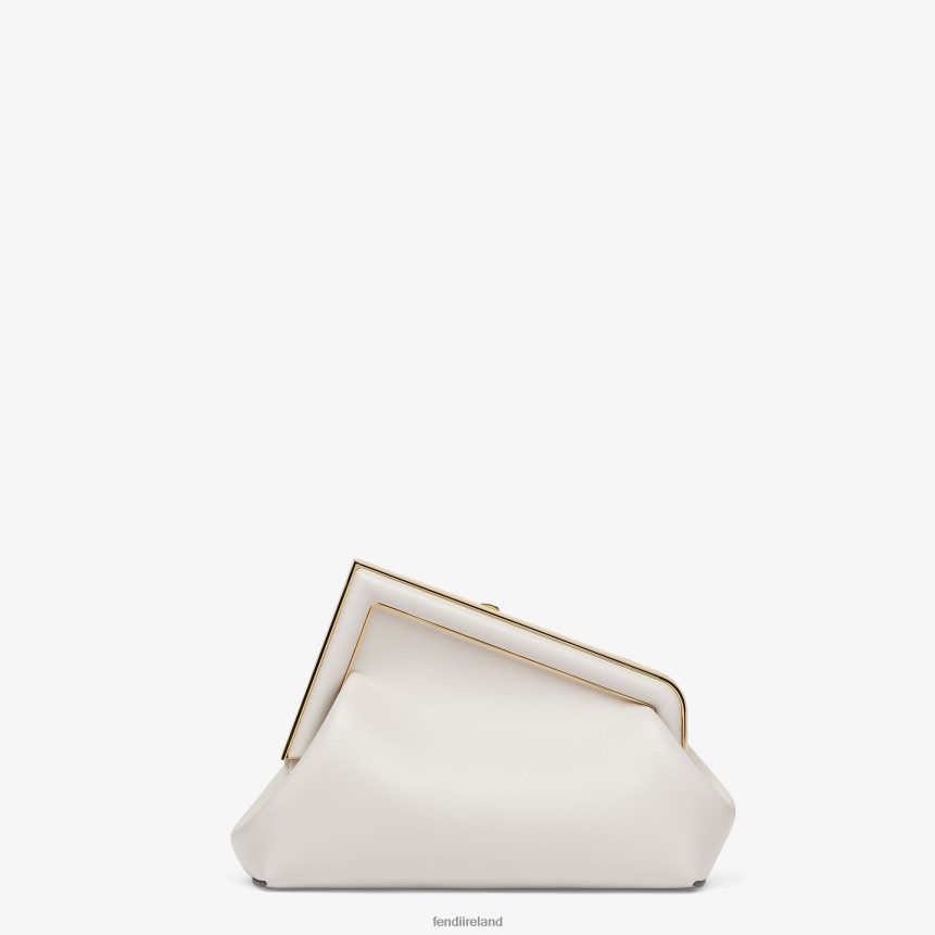 Small Fendi First bag in light gray soft nappa leather with an oversized F metal clasp with tone on tone nappa leather bands.