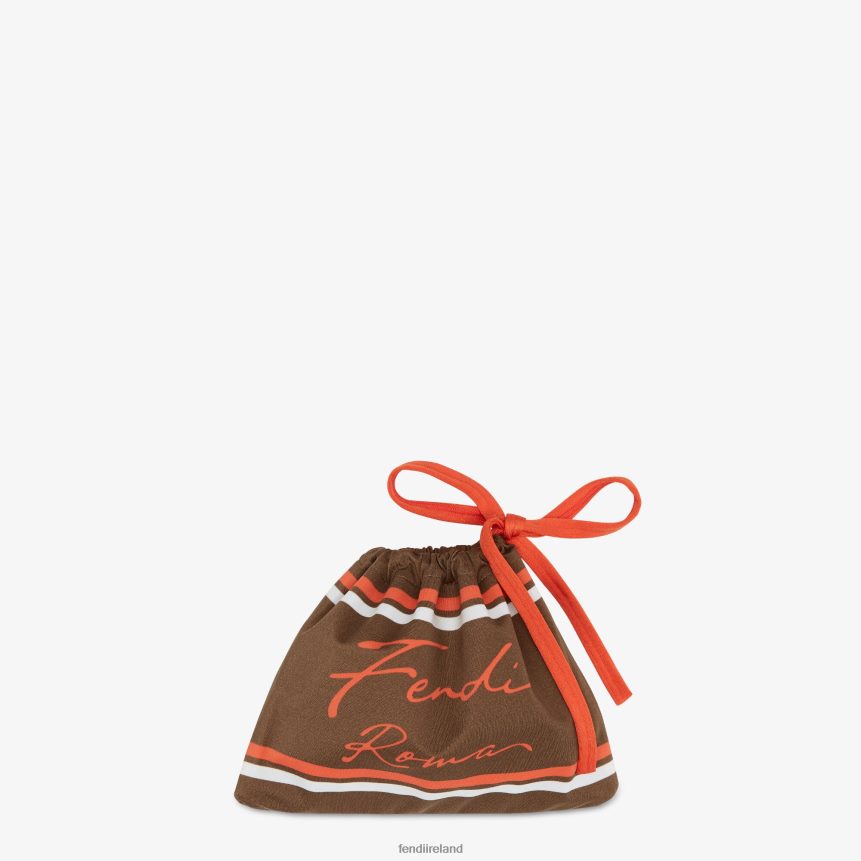 Swimsuit with one-shoulder top and high-waisted bottom. Made of brown Lycra with contrasting Fendi Astrology lettering print. Trimmed with double piping on the edges in orange and white. Matching pouch with drawstring and Fendi Roma logo.