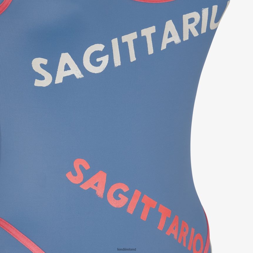 One-piece swimsuit with rounded neckline made of blue Lycra with contrasting Fendi Astrology lettering printed on the front. Trimmed with double piping on the edges and waistline in pink and white. Matching pouch with drawstring and Fendi Roma logo.