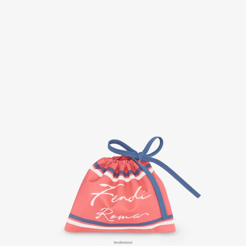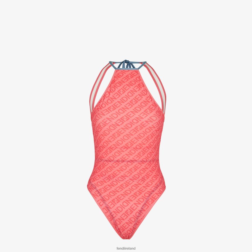 One-piece swimsuit with halter-neck, bare back and press stud fastening on the back of the collar. Made of white Lycra with contrasting Fendi Astrology lettering print on the front. Trimmed with double piping on the edges and waistline in pink and light blue. Matching pouch with drawstring and Fendi Roma logo.