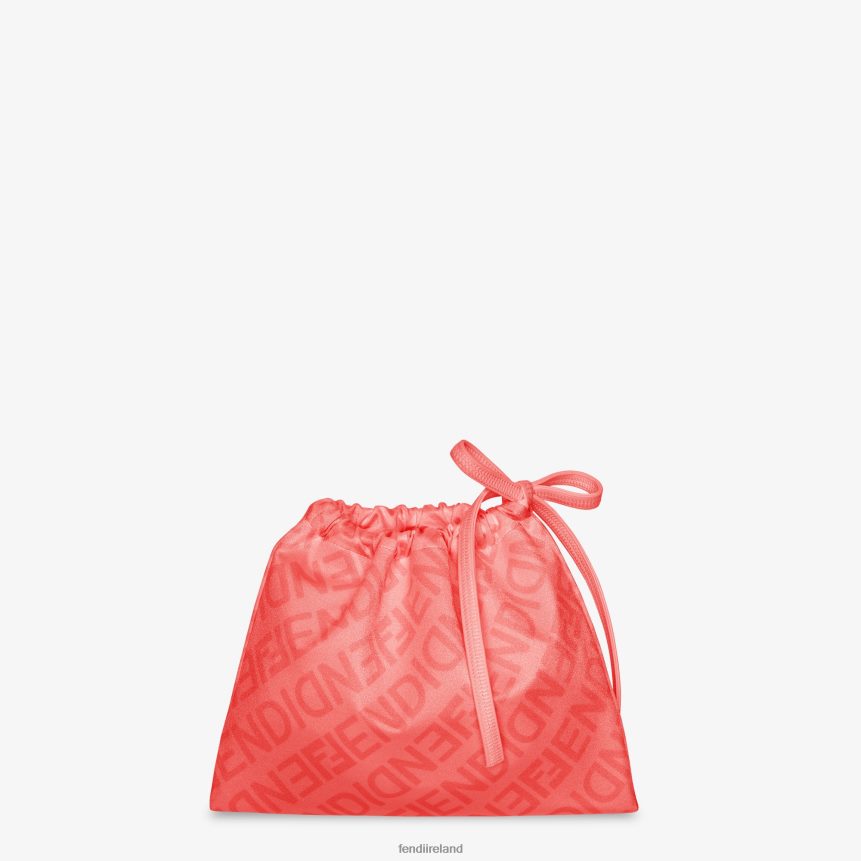 Swimsuit with rounded neckline and shoulder straps crisscrossed on the back. Made of pink Lycra with Fendi Mirror motif printed all over in the same color. Matching pouch with drawstring and Fendi Roma logo.