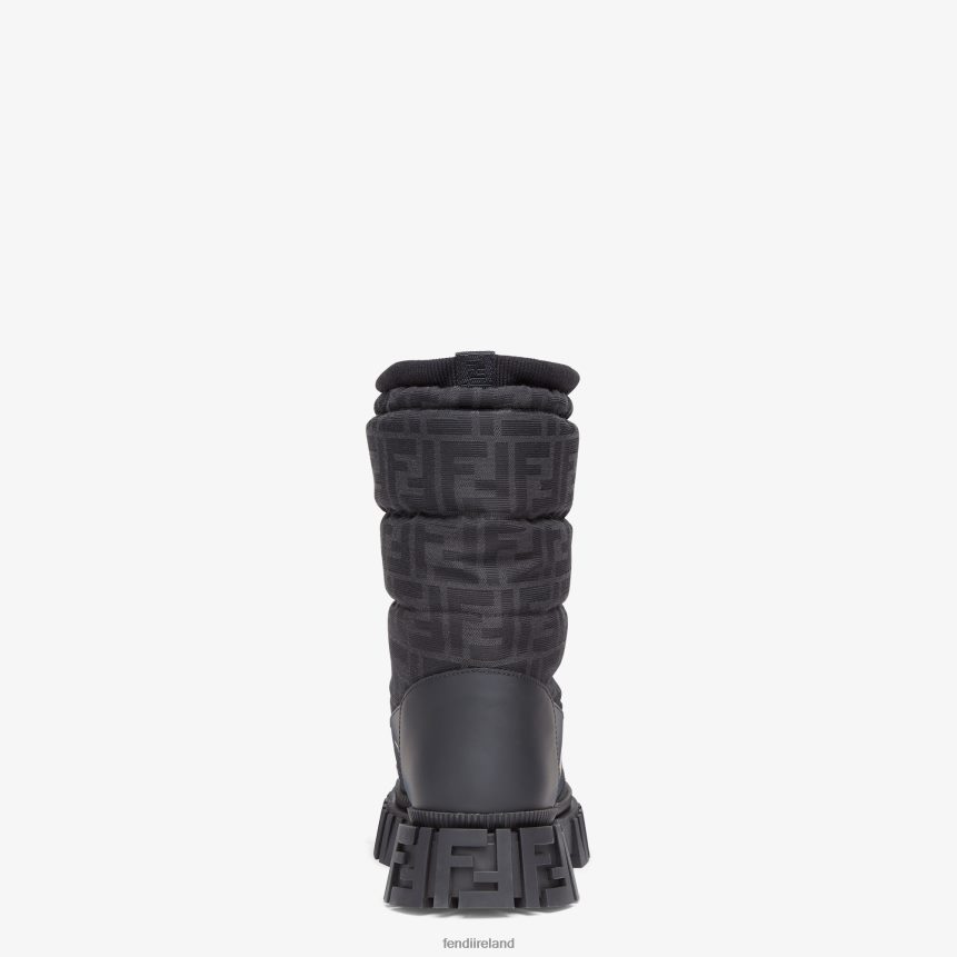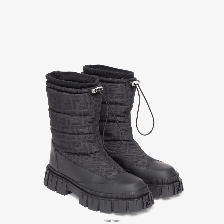 Made in ItalyFendi Force apres-ski boots with drawstring. Made of waterproof fabric with jacquard FF motif in gray and black, and black leather. Fleece lining. Light rubber sole with embossed FF detail on the toe.