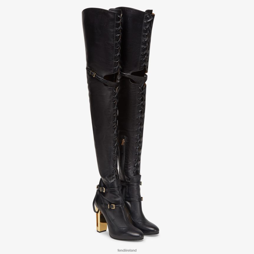 Delfina round-toe, over-the-knee boots. Closed with laces and side zipper on the inside. Made of black leather. Heel with cut-out detail and gold-colored metal FF motif.