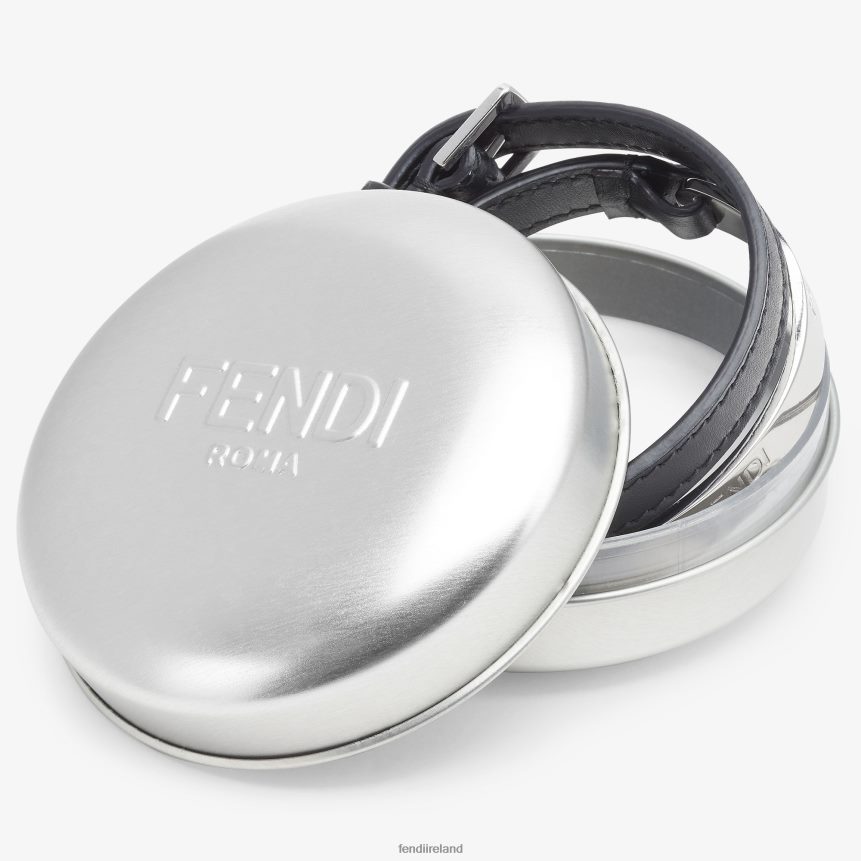 Double wrap bracelet with cufflink closure. Made of black leather. Metal detail with palladium finish and Fendi Roma engraving.