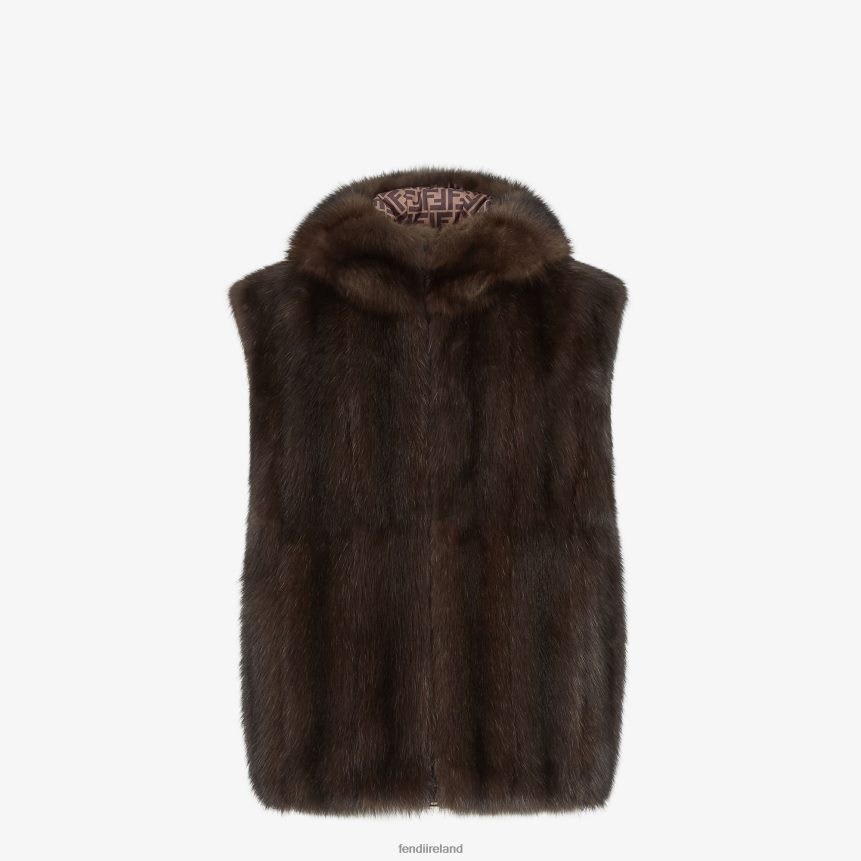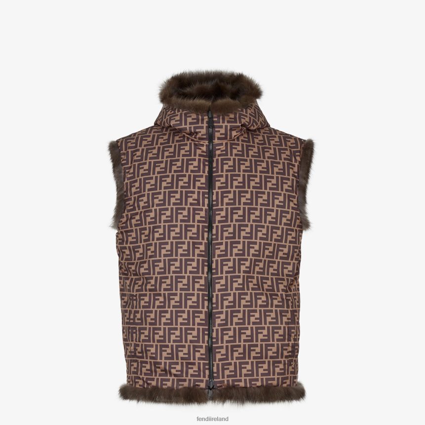 Reversible gilet with hood. Welt pockets. Zip fastening with double slider. Made of dark brown sable. Lining in all-over brown FF printed motif.