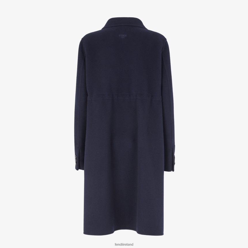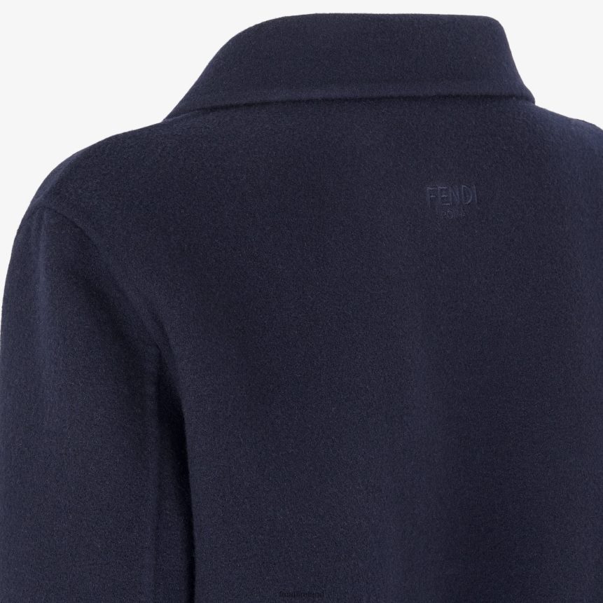 Midi pea coat with internal drawstring on the waist and welt side pockets. Straight, asymmetric hem slightly longer at the back. Double-breasted closure with buttons. Made of blue double-face cashmere. Gray lining. Embellished with matching-color Fendi lettering embroidered on the back.