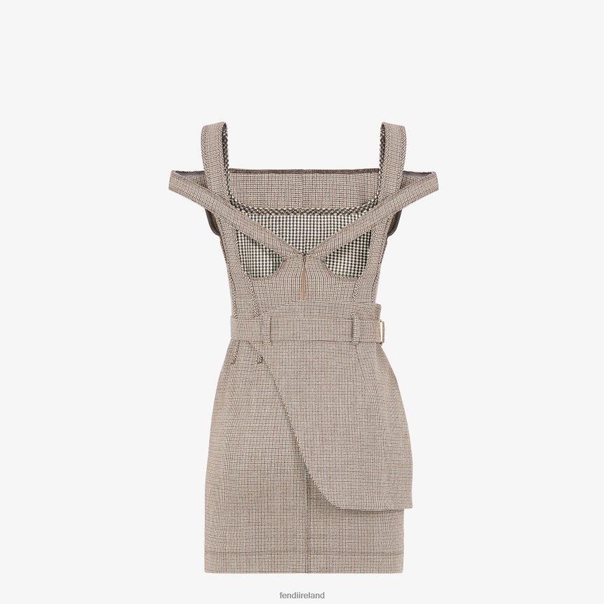 Sleeveless close-fitting short dress. The garment features a removable belt with side peplum, welt pocket and metal ring. Metal Fendi O'Lock buckle with gold finish. Made of wool blend fabric with a beige houndstooth motif. Gold-finish metalware.