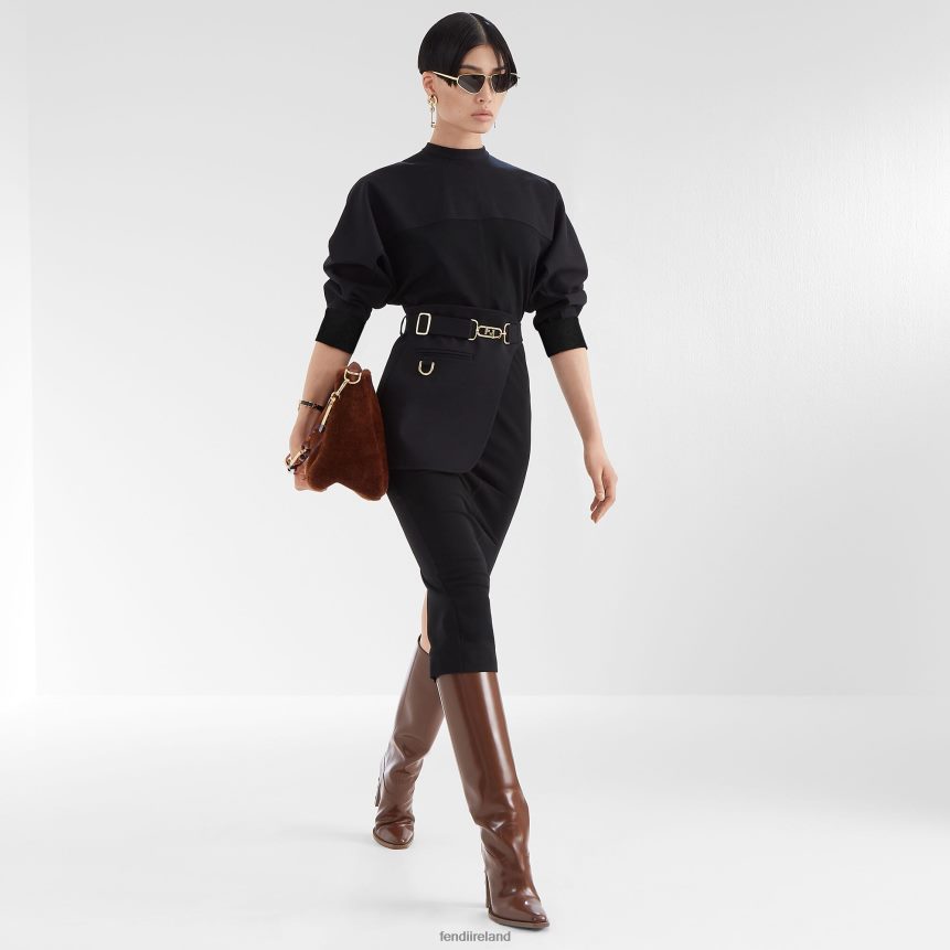 Crew neck fitted midi dress. The garment features a removable belt with side peplum, welt pocket and metal ring. Metal Fendi O'Lock buckle with gold finish. Closed with full-length zip at the back. Made of black double-face jersey.