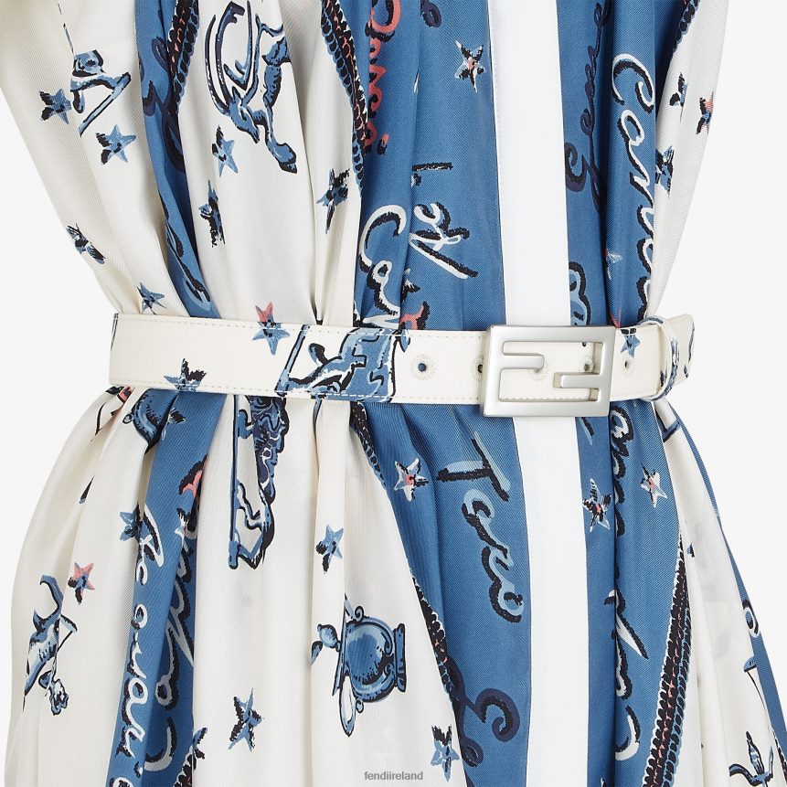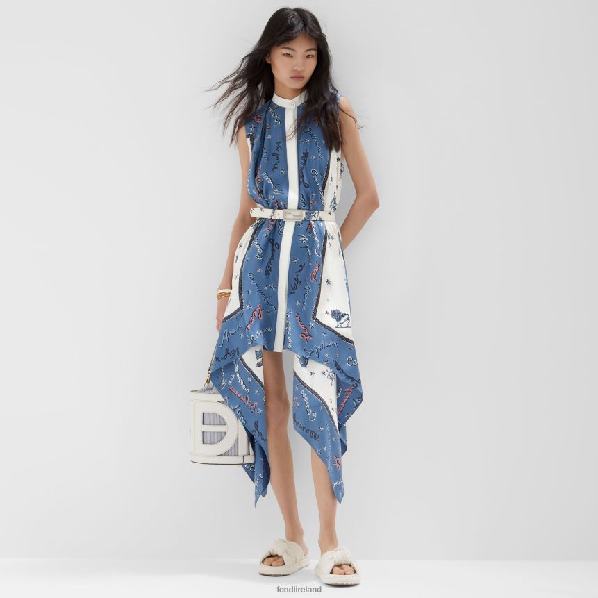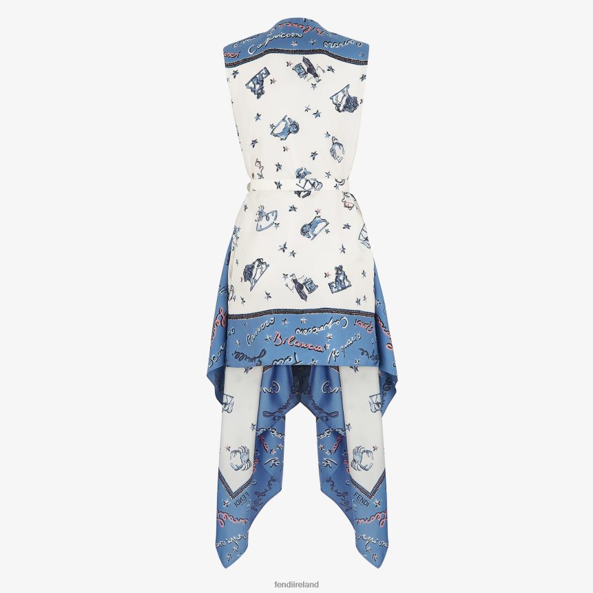 Short sleeveless dress with mandarin collar. The silhouette is defined by the large, flowing foulard-style panels on the front. Concealed front fastening. Made of silk twill in blue and white. Customized with an all-over Fendi Astrology motif print.