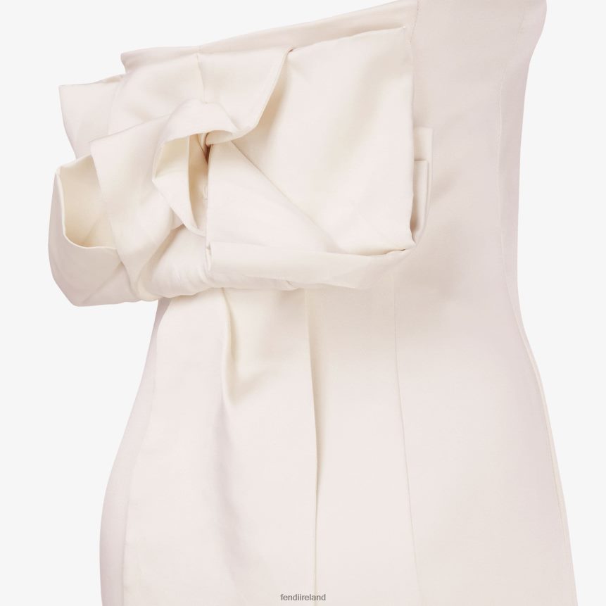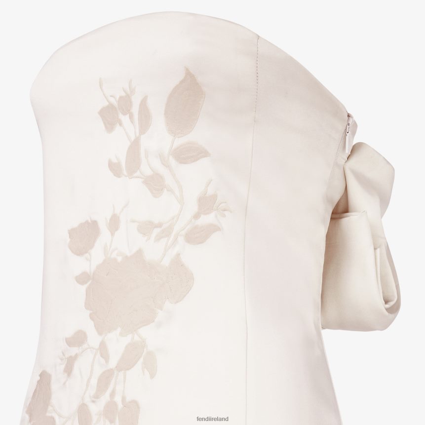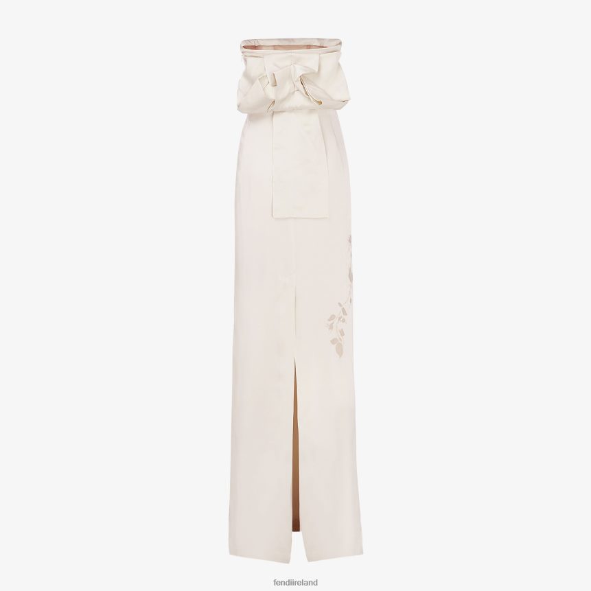 Long bustier dress with a fluid, straight cut. Centre slit at the back. Side zipper closure. Made of light beige silk, with the Fendi Roses motif hand-painted on the front in the same tone. Obi belt with knotted motif on the back waist.