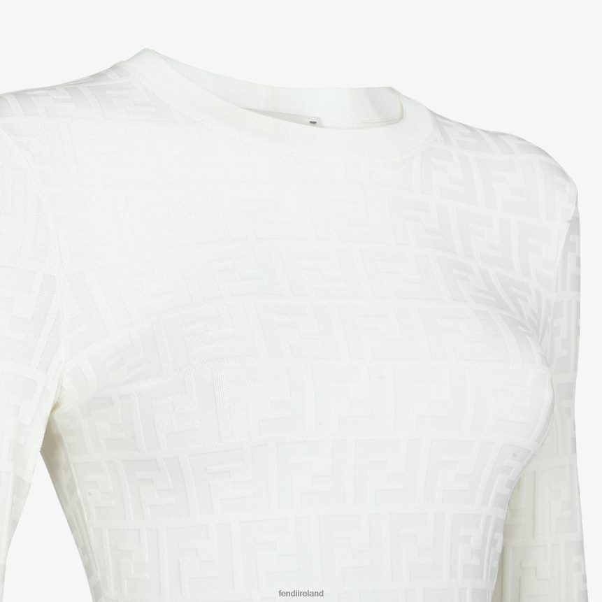 Long-sleeved crew-neck short dress. Fitted. Made of white viscose knit with raised all-over FF motif.