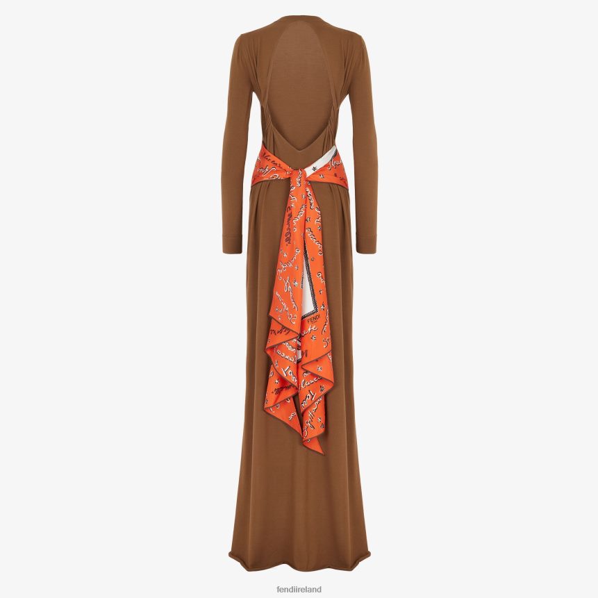 Long dress with round neck and long sleeves. Fitted cut with deep side slits. Made of brown, lightweight wool knit. The back features a cut put detail and long silk foulard ties to fasten around the waist, with Fendi Astrology motif in orange and white. Embellished with ribbed cuffs and collar and raw edge hem.