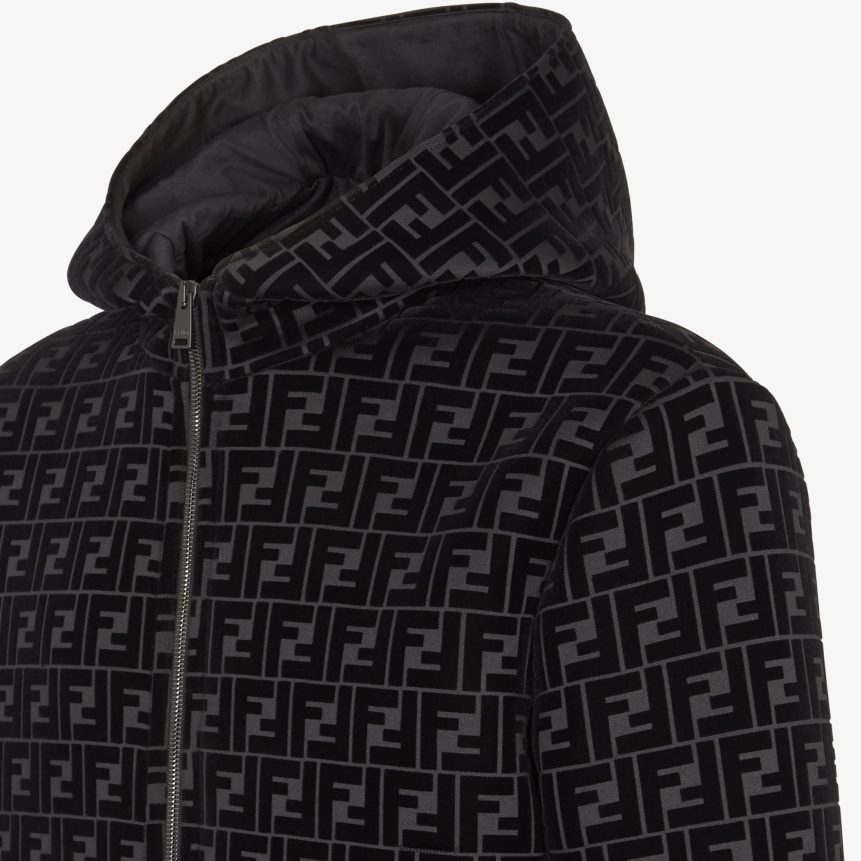 Hooded sweatshirt with double slider zipper closure. Stretch knit cuffs and hem. Made of black pique jersey with tone on tone, all-over FF flocked print motif.