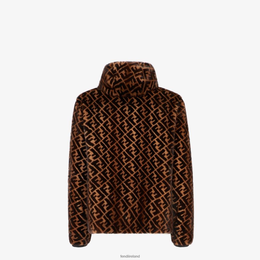 Reversible jacket with hood and two pockets. Zip fastening. Made of brown mink with diagonal FF motif printed all over. Nappa leather interior.
