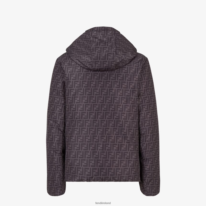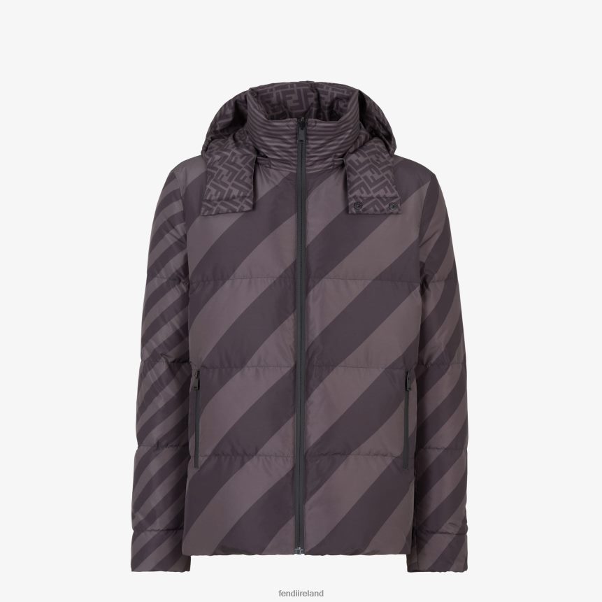 Reversible padded jacket with hood and pockets on both sides. Zip fastening. Made of nylon and customized on one side with a black and gray FF pattern. The other side has a striped Pequin motif in the same colors.