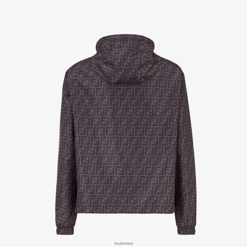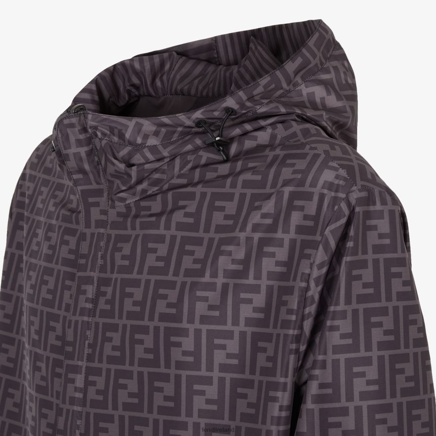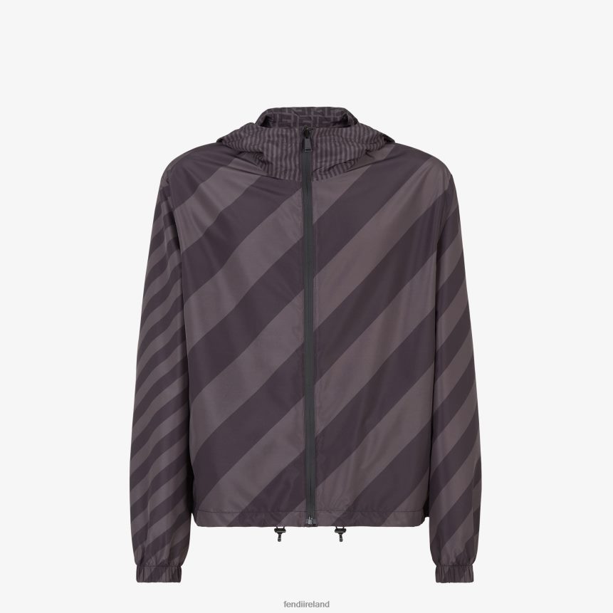 Reversible jacket with hood and side pockets. The style has a relaxed fit with elasticated cuffs and bottom hem. Front zip fastening. Made of nylon and customized on one side with a black and gray FF pattern. The other side has a striped Pequin motif in the same colors.