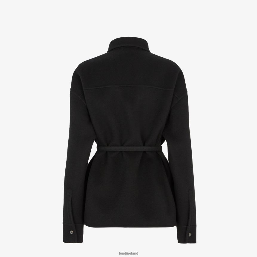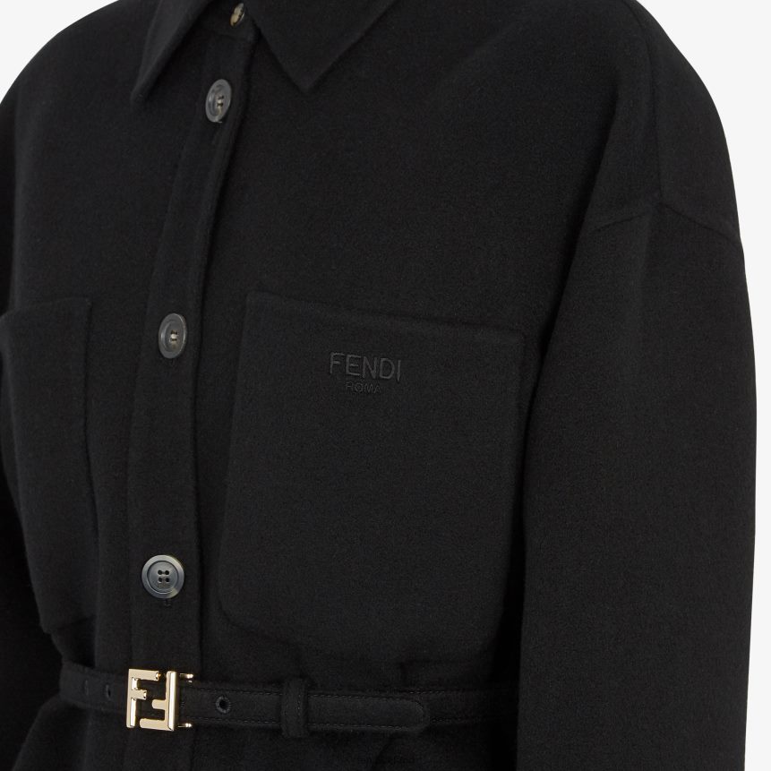 Single-breasted Go-To Jacket with shirt collar and low-cut set-in sleeves. Matching belt with metal FF buckle. Oversized patch pockets on the chest and pockets on the sides. Button closure. Made of black double-faced cashmere. Embellished with Fendi lettering in matching-tone embroidery on the left breast pocket as worn.