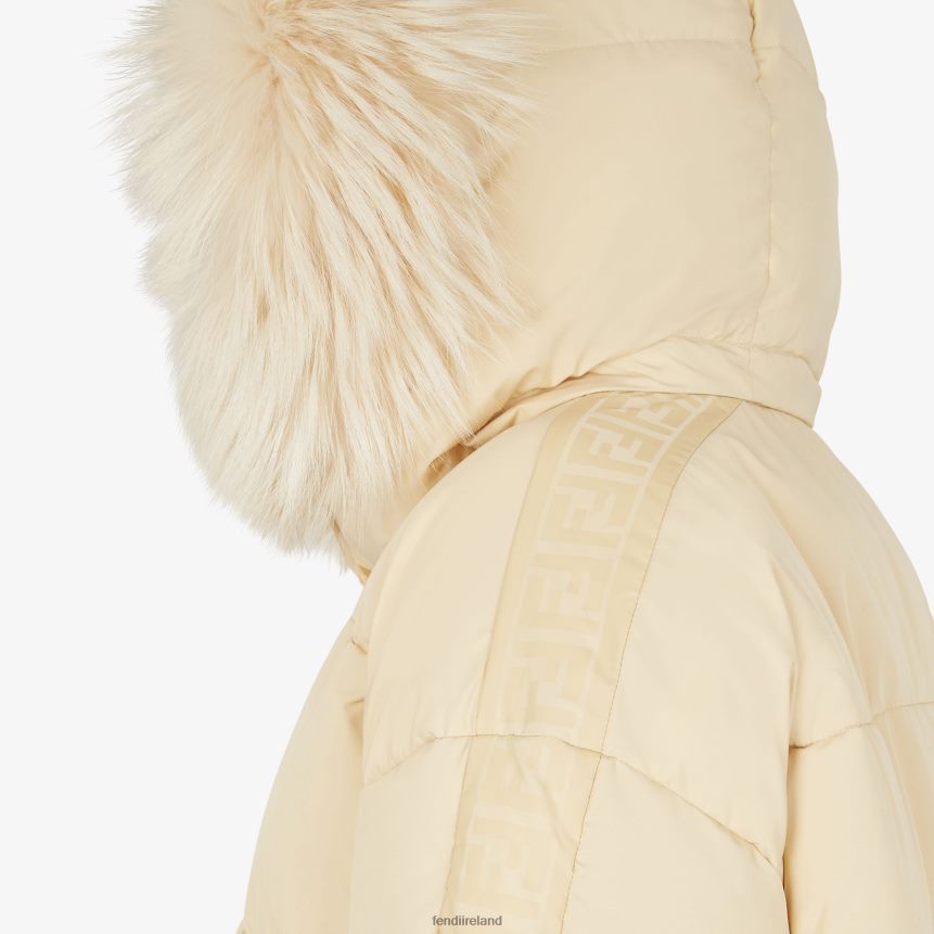 Reversible down jacket with removable hood trimmed with fox fur. Knitted cuffs and drawstring at hem. Zipper closure. Made of cream nylon, with regenerated and quilted duck down padding. One side is customized with oversized matching-tone FF pattern, the other is solid color with matching-tone FF band printed on the sleeves.