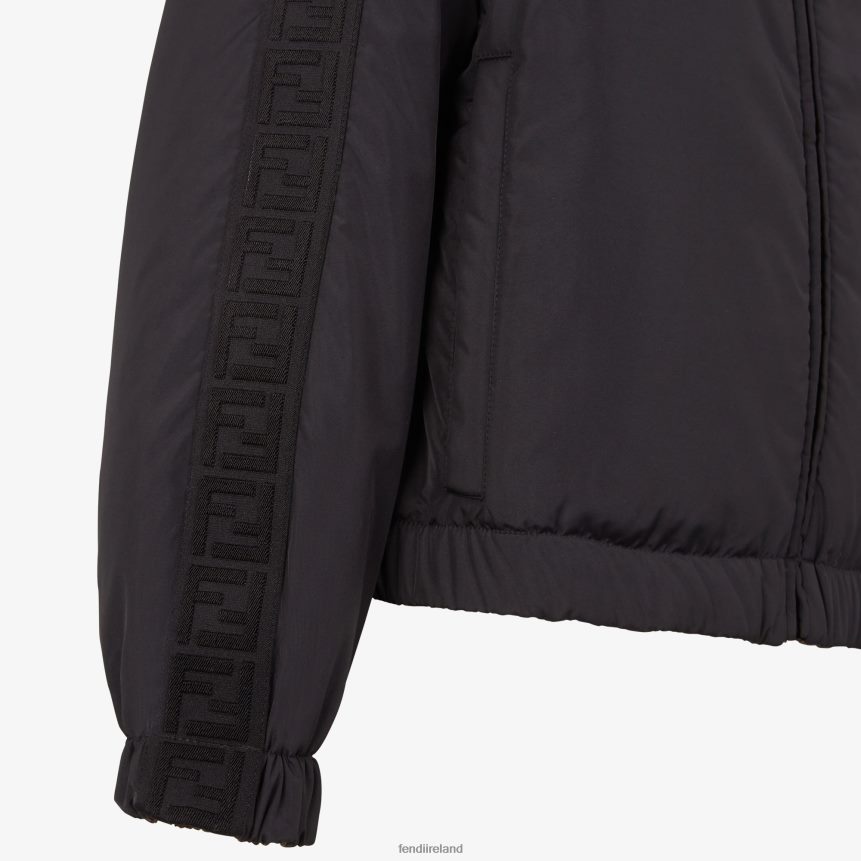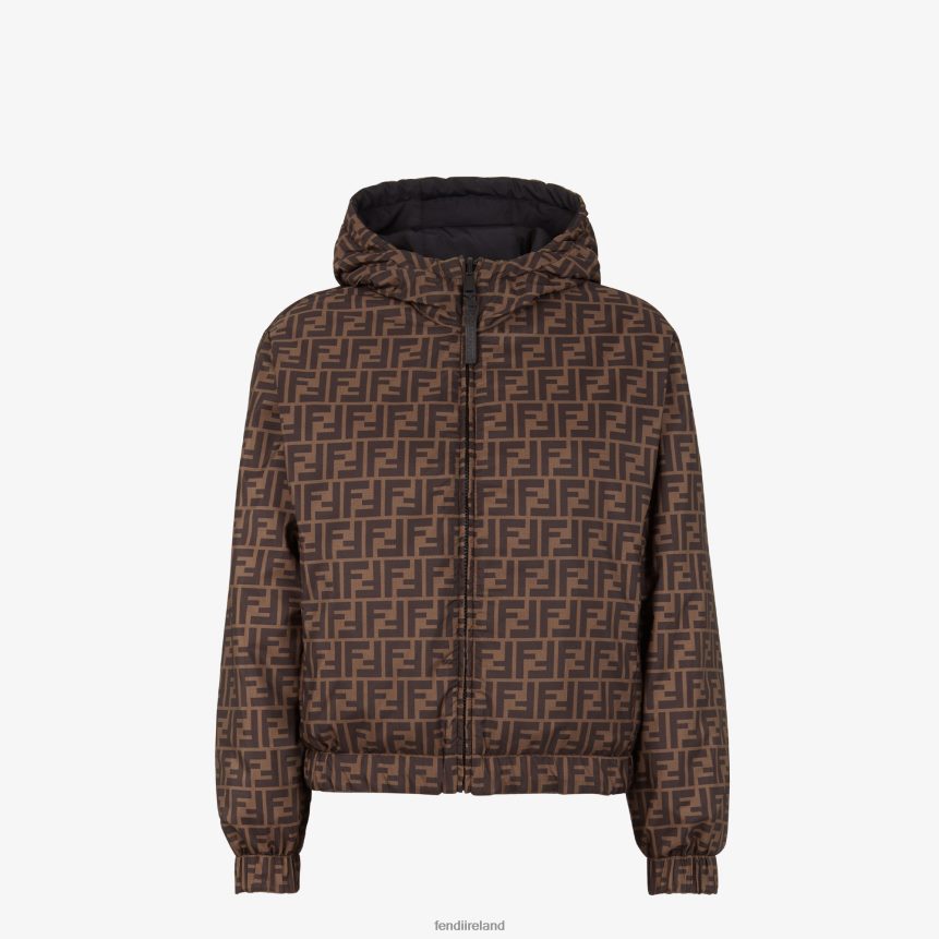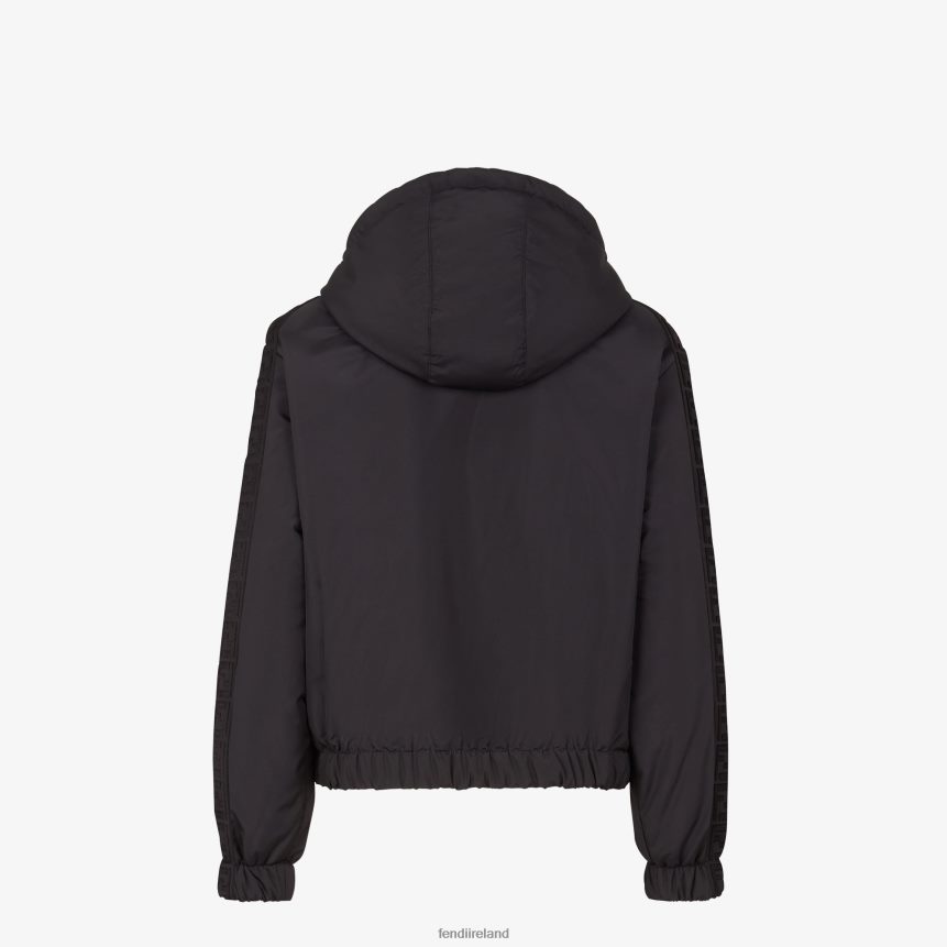 Reversible windbreaker with drawstring hood and zipper closure. Stretch inserts at the cuffs and hems. Made of black nylon, trimmed with matching FF stripe on the shoulders and sleeves. Nylon lining with brown FF motif.