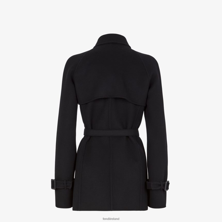 Single-breasted Go-To Jacket with shirt collar and low-cut set-in sleeves. Featuring a shirt collar, and with adjustable straps at the cuff. Matching belt with metal Fendi O'Lock buckle. Made of black double-face wool with gray FF lining. FF Karligraphy customized buttons.