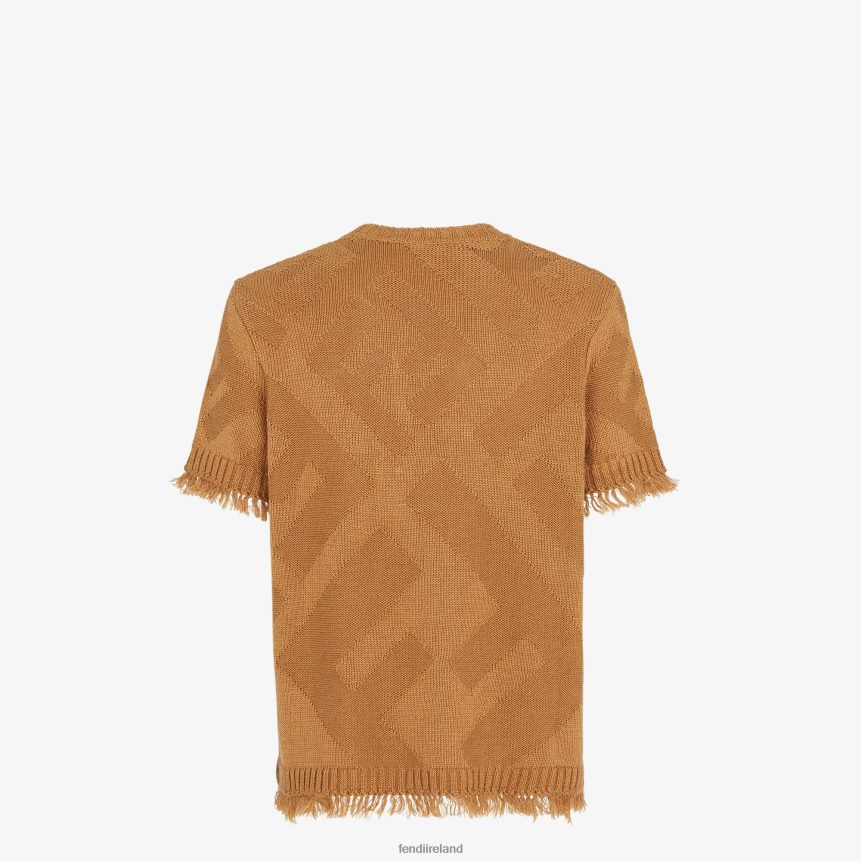Short-sleeved, crew neck sweater. Made of brown cotton yarn, with diagonal oversized FF motif intarsia all over. Finished with frayed edges at the cuff and garment hem.