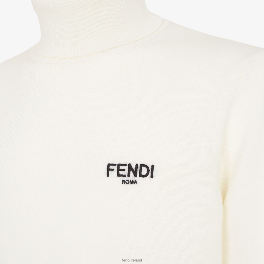 Sweater with high collar and long sleeves. Made of white knit. Embellished with embroidered logo on the chest.