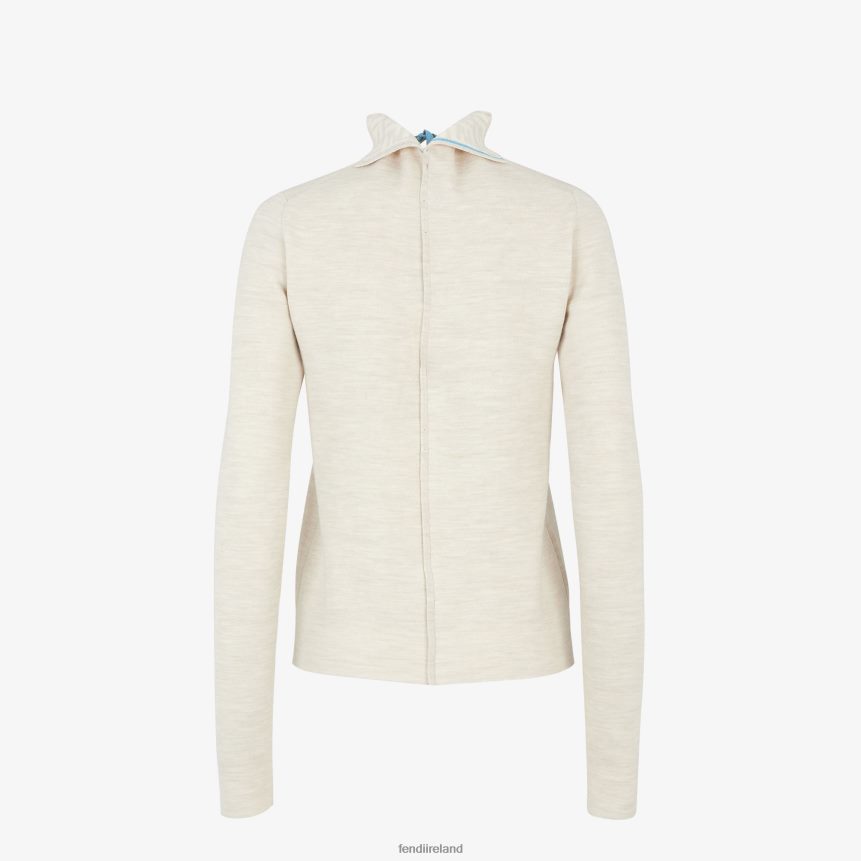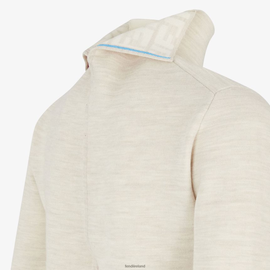 Double-faced pullover with long sleeves. The high collar is finished with a center-back slit. Made of wool yarn with one beige solid-colored side and all-over FF motif in the same color on the other side. Finished with piping and inner tie to knot at the collar in light blue.