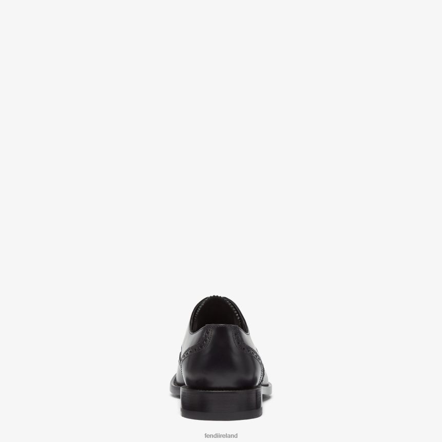 Derby lace-ups with brogue stitching. Made of black leather. Embellished with Fendi Shadow leather with tone on tone FF motif and textured stripe.