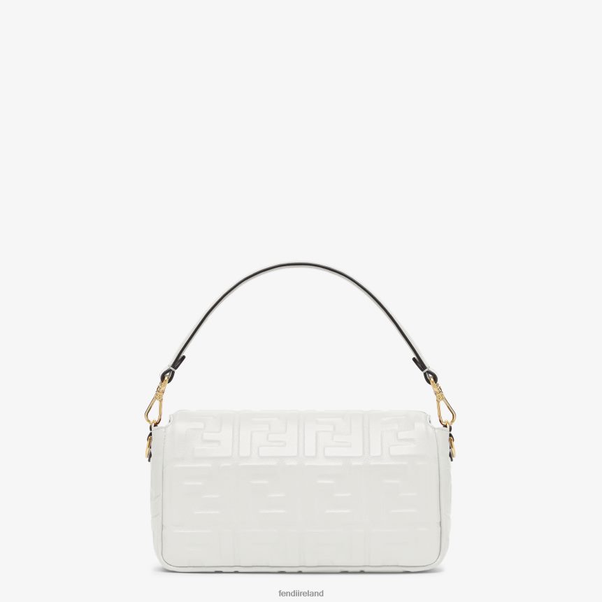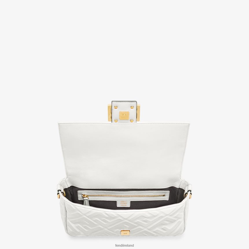 Iconic medium Baguette bag made of white soft nappa leather with a three-dimensional texture FF motif. Decorated with an FF clasp.