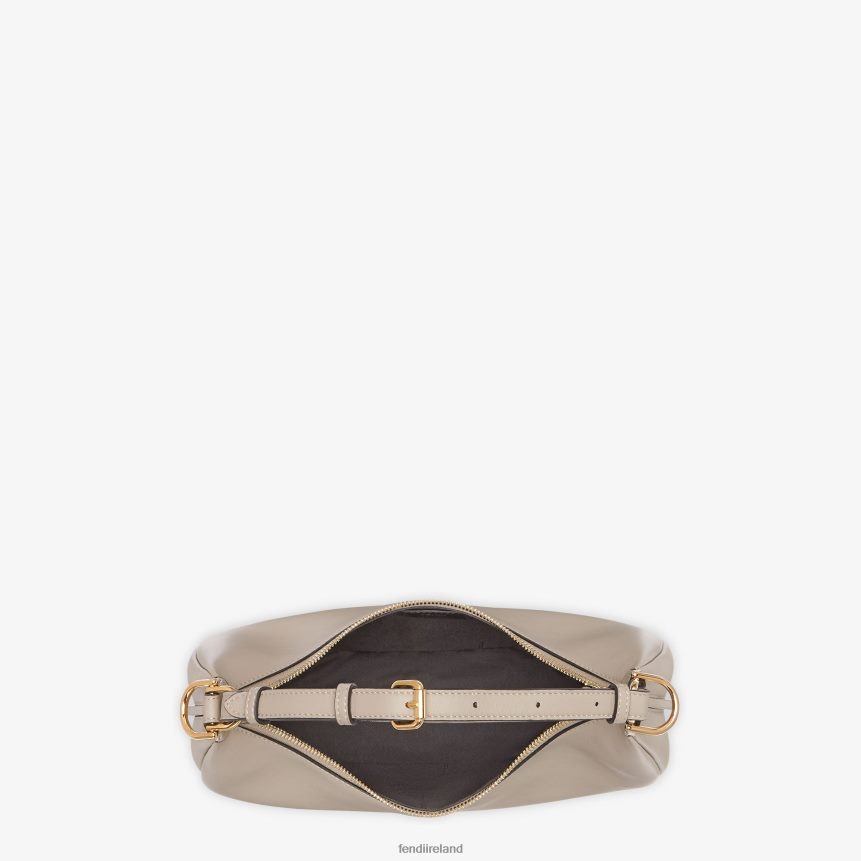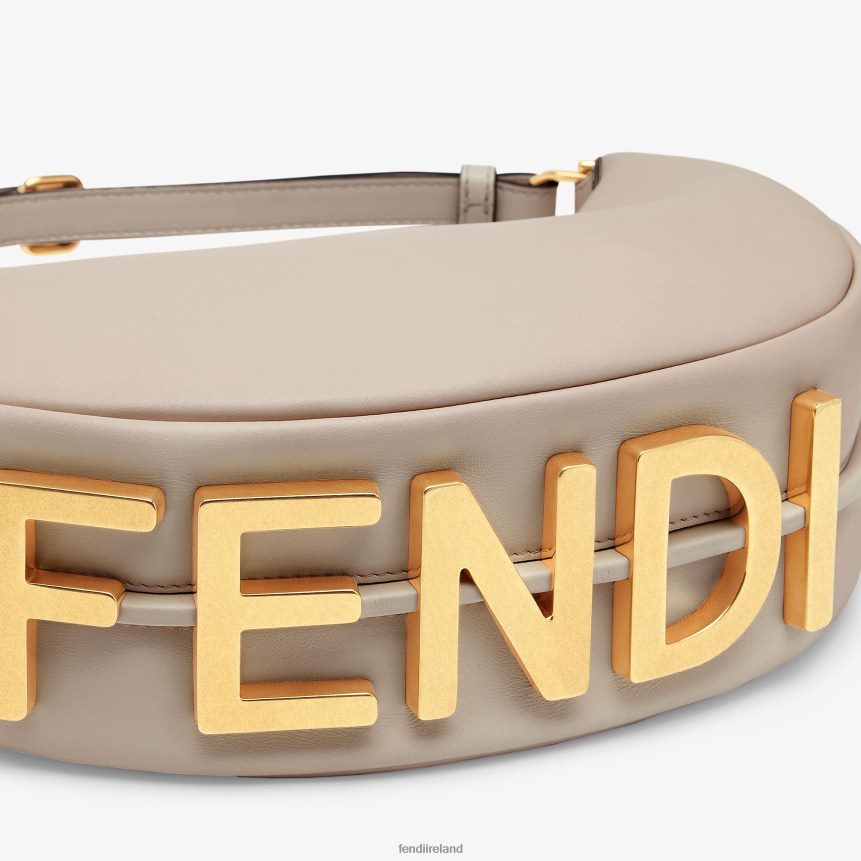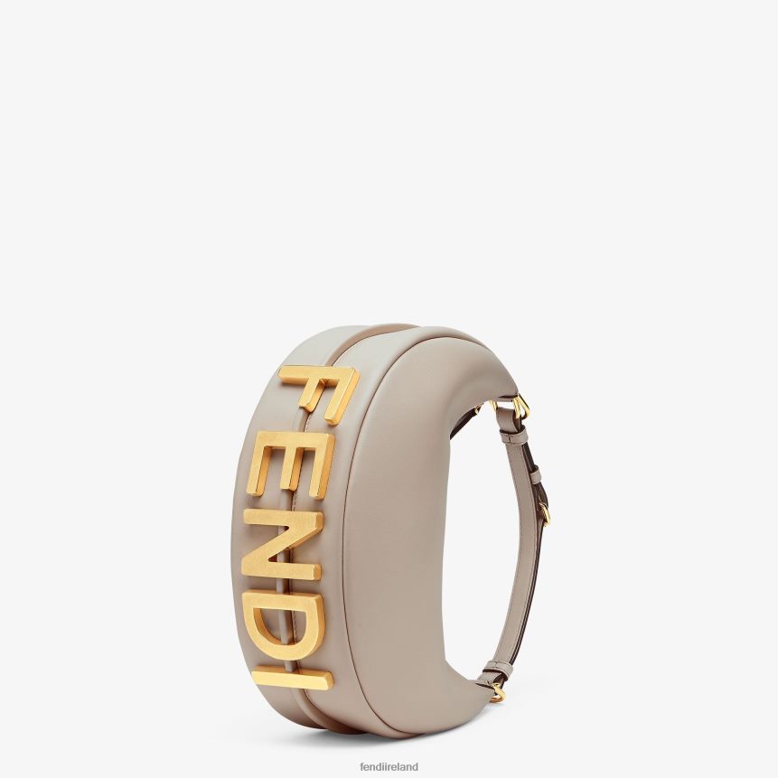 Small hobo bag made of soft, dove gray leather, decorated with vintage gold metal FENDI lettering visible when wearing the bag under the arm.