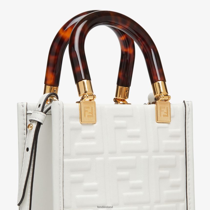 Mini Sunshine Shopper bag made of white leather with 3D texture FF motif and rigid tortoiseshell-effect plexiglass handles.