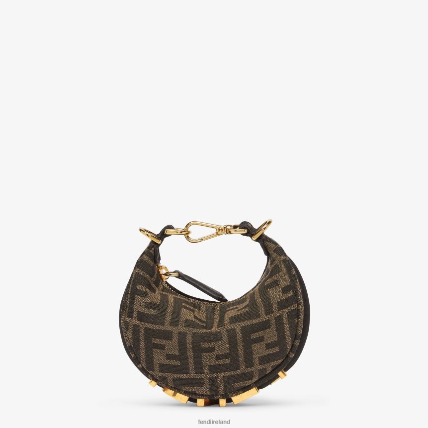 Nano Fendigraphy Hobo bag with zipper closure, embellished with vintage gold metal FENDI lettering. The adjustable strap with a clip allows it to be attached to larger bags or worn on the wrist. Comes with hooks for the shoulder strap. Made with the iconic jacquard FF fabric. Brown nappa leather details. Gold-finish metalware.