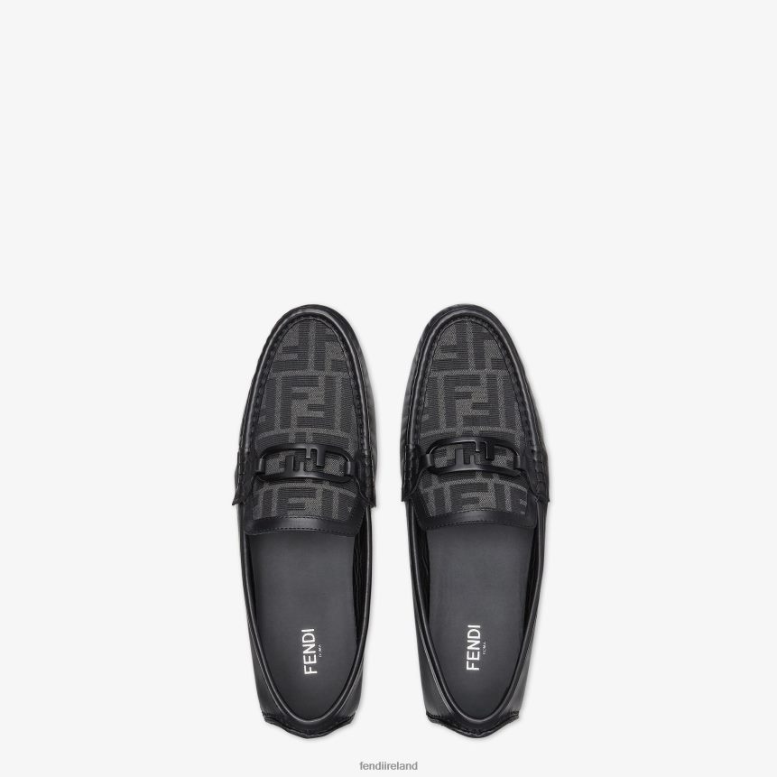 Driving loafers. Flexible pebble soles. Made of black leather with FF fabric details. Embellished with a metal Fendi O'Lock buckle with an ultra-black ruthenium finish.