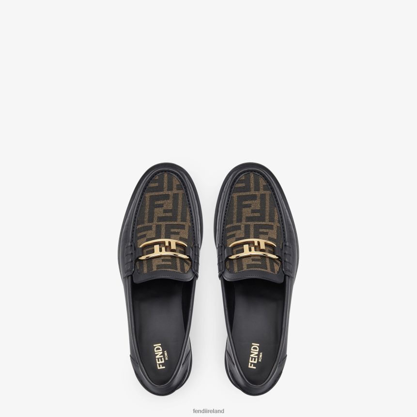 Loafers with visible stitched shoe apron and upper decorated with Fendi O'Lock detail. Made of black leather with FF jacquard fabric insert. Gold-finish metalware.