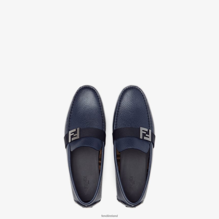Driving loafers. Flexible pebble soles. Made of blue leather. Matching ribbon with FF Squared palladium-finish metal detail.
