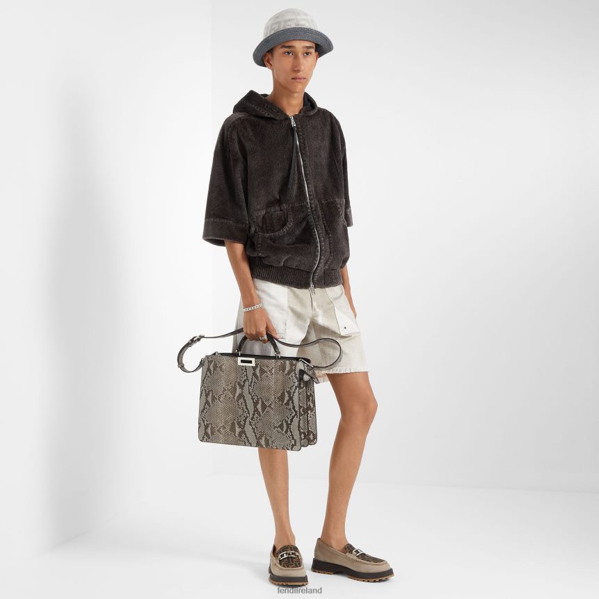 Loafers with visible stitched shoe apron and upper decorated with Fendi O'Lock detail. Made of beige nubuck leather. Shoe apron in brown and tobacco jacquard FF fabric. Palladium-finish metal accessories. Embossed rubber sole.