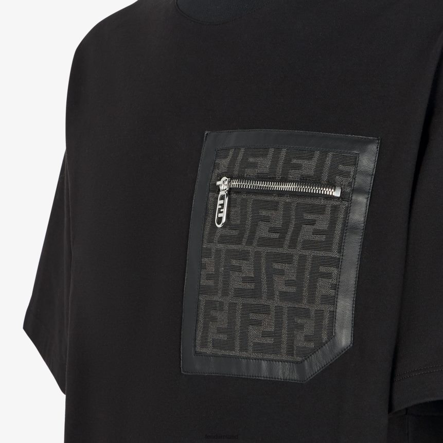 Skater-style T-shirt with zipper pocket on the chest. Crew neck and short sleeves. Made from black cotton jersey. The breast pocket is embellished with a jacquard FF fabric insert and leather trim in the same colors.