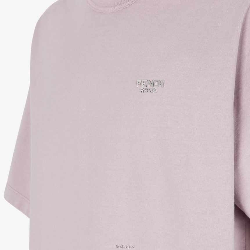 Short-sleeved, crew-neck skater-style T-shirt. Made of washed lilac cotton jersey. Customized with palladium-finish metal small Fendi Roma lettering on the chest.