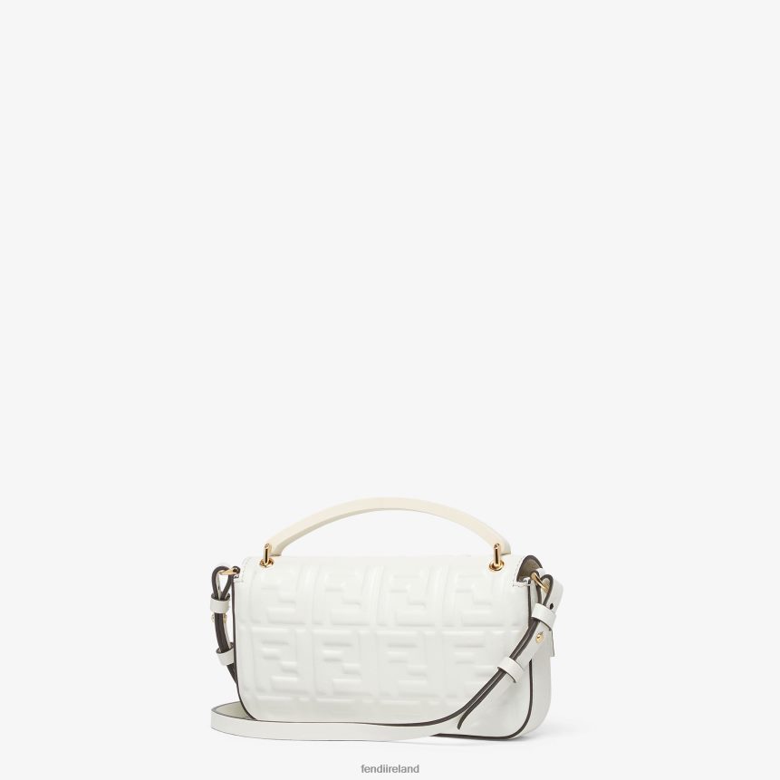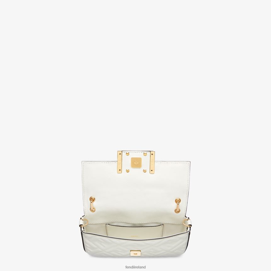 Baguette smartphone pouch with front flap and FF magnetic button closure. Small handle, adjustable and removable shoulder strap. Made of white leather with an embossed three-dimensional FF motif. Metal accessories in a vintage-gold finish.