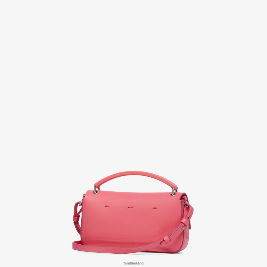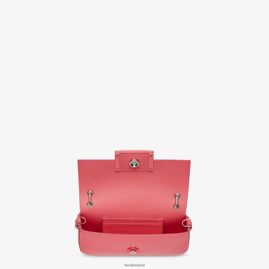 Baguette smartphone pouch with front flap and FF magnetic button closure. Small rigid handle and detachable shoulder strap. Made of pink patent leather with nuanced glossy effect. Tone-on-tone enameled FF motif. Palladium-finish metalware.