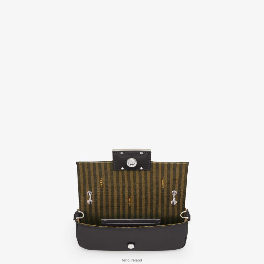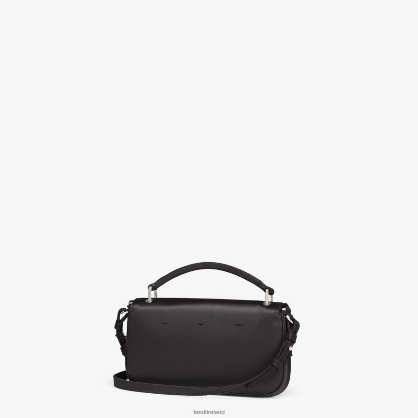 Baguette smartphone pouch with front flap and FF magnetic button closure. Small handle and detachable shoulder strap. Made of black silk satin. Palladium-finish metalware.