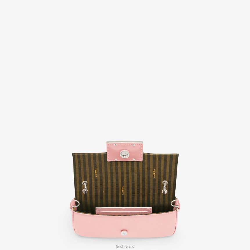 Baguette smartphone pouch with front flap and FF magnetic button closure. Small handle and detachable shoulder strap. Made of pink silk satin. Palladium-finish metalware.